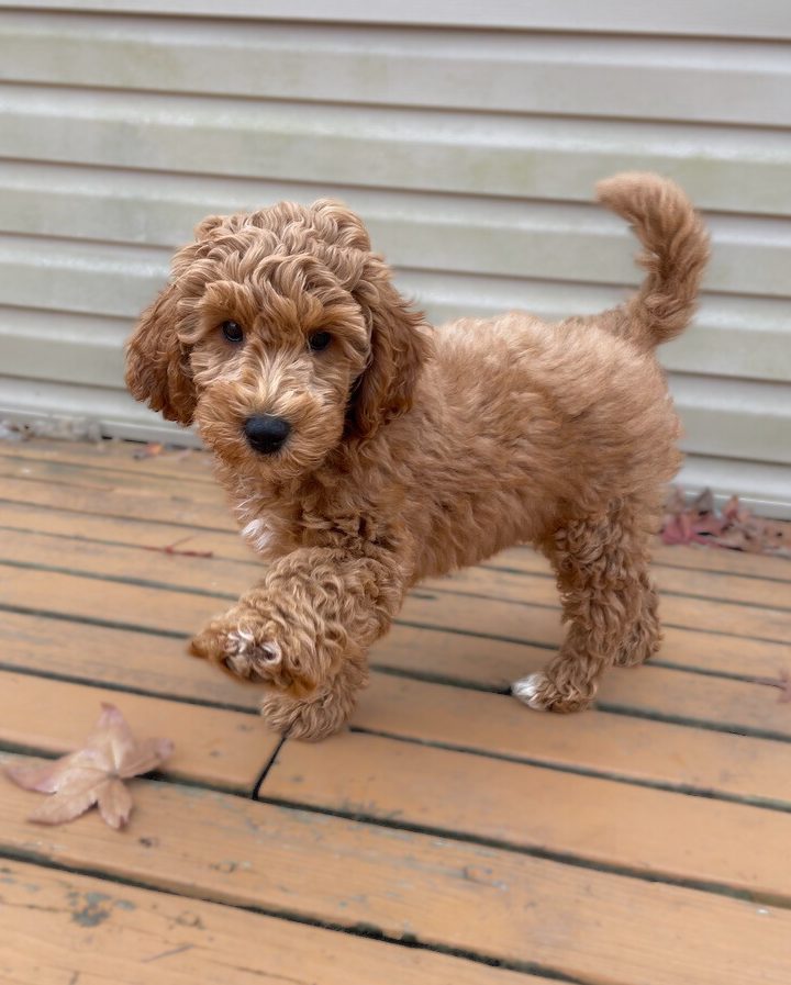 Boaz is a head-turner! His beautiful coat, adorable face, and charming personality demand attention everywhere he goes – and Boaz loves it! This apricot mini English Goldendoodle LOVES playing Frisbee in the backyard. He’s quick, agile, and he knows just how to beat the other dogs when they’re all chasing his disc. Indoors, Boaz trades his beloved disc for a trusty ball, which he enjoys retrieving again and again. Boaz is a calm, loyal dog who is sure to be close to his human dad’s side. From shopping at Lowes to canoeing to lounging at home, Boaz is happy to participate in any activity alongside you. Boaz lives in a guardian home where he is totally adored! Find out more about Boaz by checking out our partner breeder, Timberidge Goldendoodles.